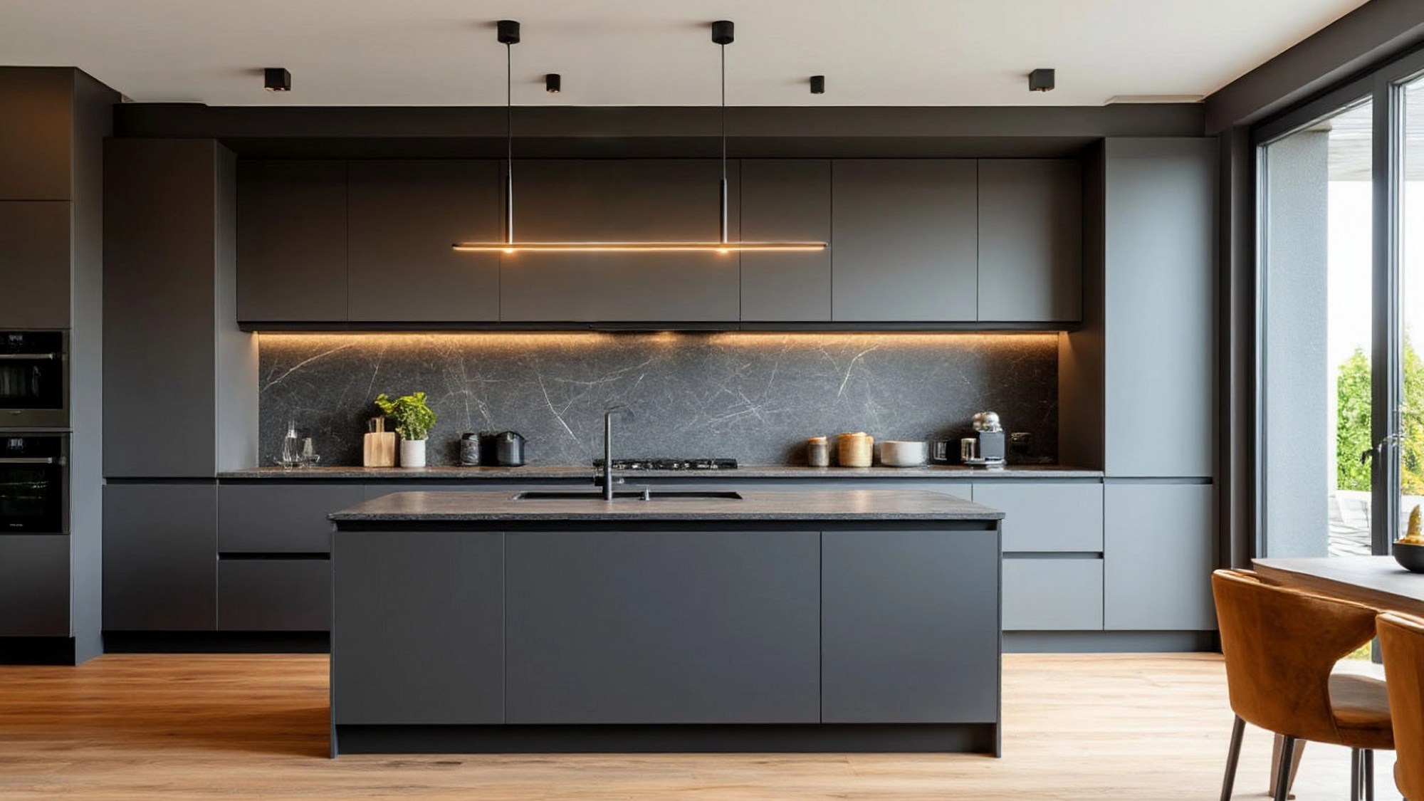 Бытовая техника также интегрируется в кухню "Графит" максимально аккуратно. Встраиваемые модели формируют ровную линию фасадов, не нарушая цельность конструкции. Техника становится частью общей композиции, а не визуальным элементом, который выбивается из общего ритма. Благодаря такому подходу создаётся ощущение цельности — будто кухня была задумана как единый монолитный объект, а не собранный из отдельных модулей. Это качество особенно ценят люди, стремящиеся к визуальному порядку в интерьере.