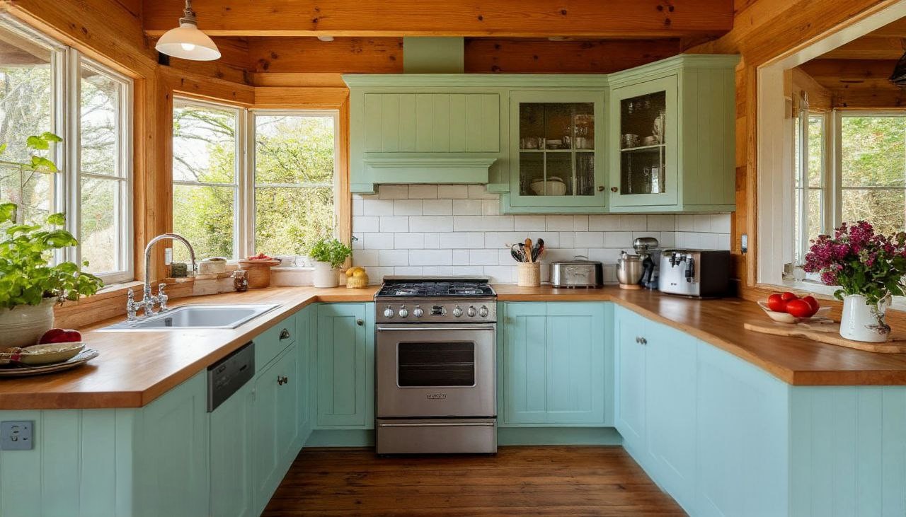 Фасады кухни выполнены в нежном светло-зеленом оттенке, который мягко сочетается с натуральными материалами, используемыми в интерьере, и гармонирует с окружающей природой, особенно если кухня установлена в загородном доме с видом на сад или террасу. Светлые тона фасадов визуально расширяют пространство, делая кухню более воздушной и светлой, а матовая текстура поверхности добавляет ощущение тактильного тепла и уюта. Этот оттенок идеально подходит для создания атмосферы умиротворения и легкости, характерной для стиля дача, где хочется расслабиться после трудового дня и насладиться спокойствием домашнего очага.