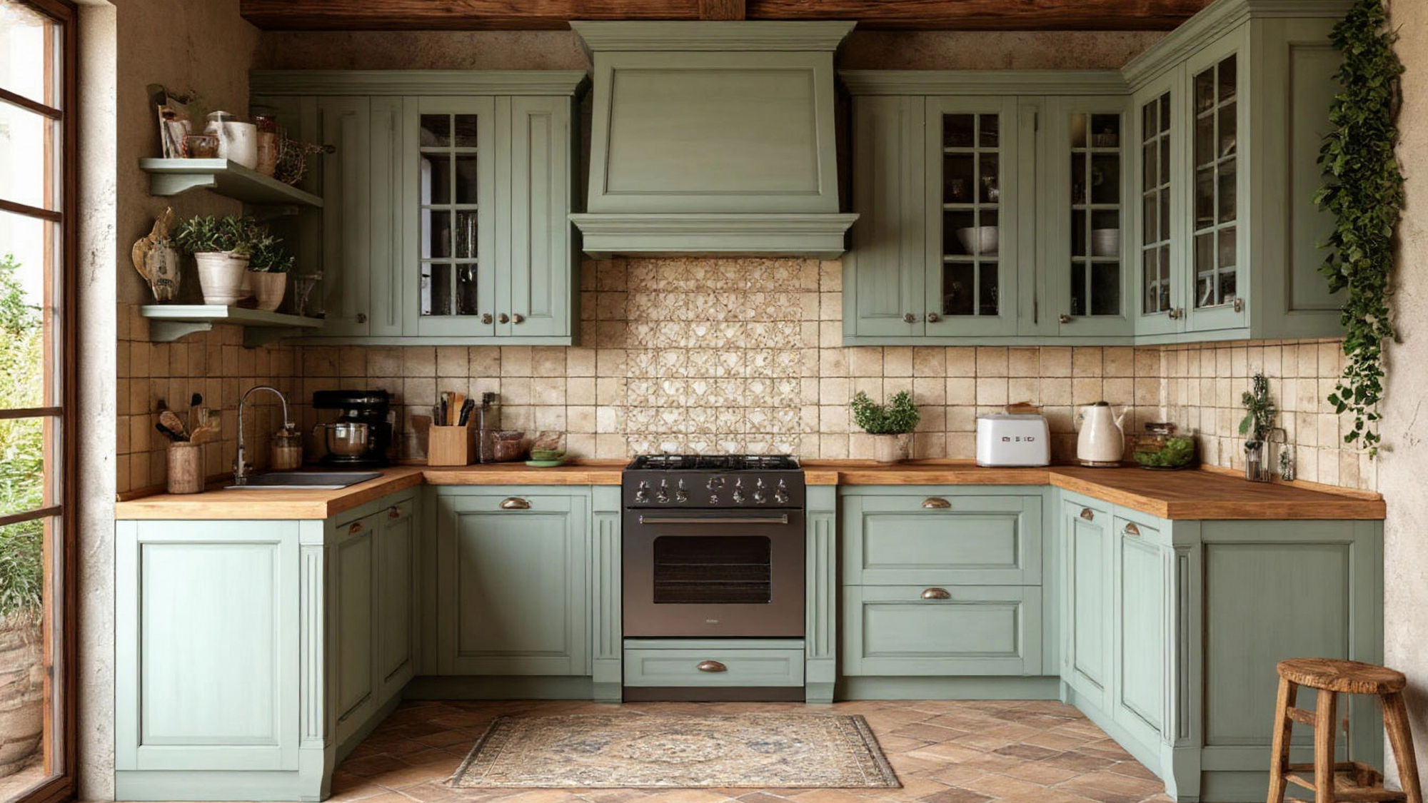 Отдельного внимания заслуживает сочетание кухни с отделкой стен и пола. Светлая плитка с классическим рисунком на фартуке поддерживает атмосферу уюта и напоминает о традиционных интерьерах юга Франции. Она гармонирует с зелёными фасадами и тёплой столешницей, создавая цельный и спокойный образ. Пол, выполненный в натуральных оттенках, усиливает ощущение основательности и уюта, делая пространство визуально тёплым и устойчивым.